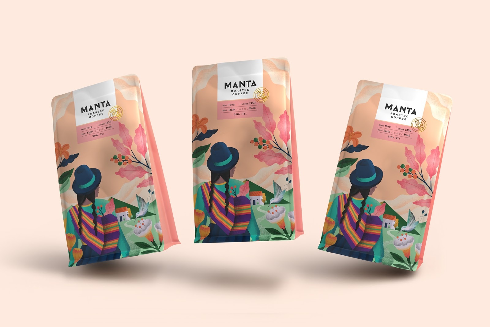 客戶從一開始就很清楚,咖啡包裝設計他們想以更具比喻性的方式展示秘魯及其性質(zhì)。使用這里生長的花朵,山脈,甚至是鏟尾蜂鳥,瀕臨滅絕的鳥,當然還有毯子:品牌名稱背后的靈感。